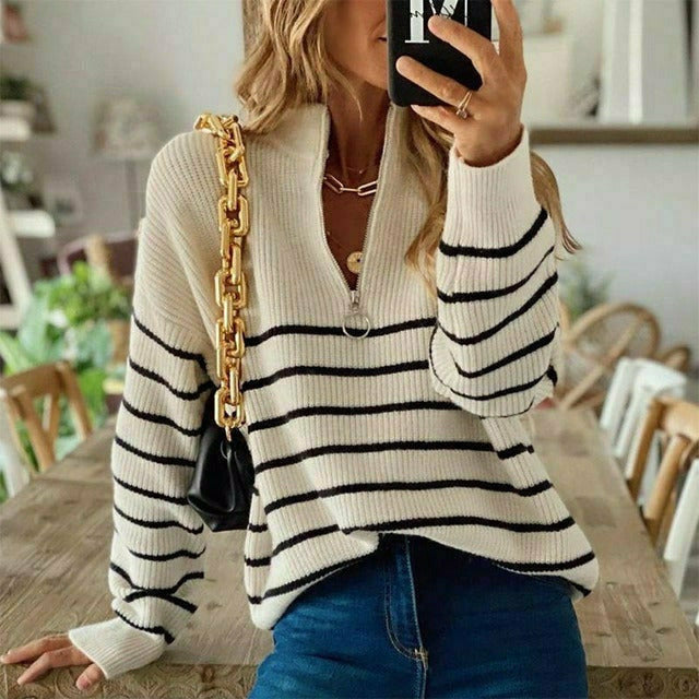 Avslappnad Randig Stickad Tröja